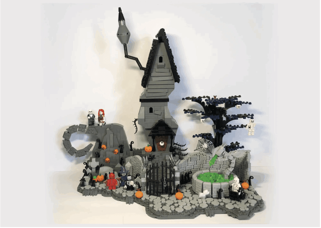 A: The release of the Jack & Sally CMF’s in the Disney Series really. I wanted a place to display them and started to build the Spiral Hill section to display in a deep-set picture frame. The rest of Halloween town developed from there.