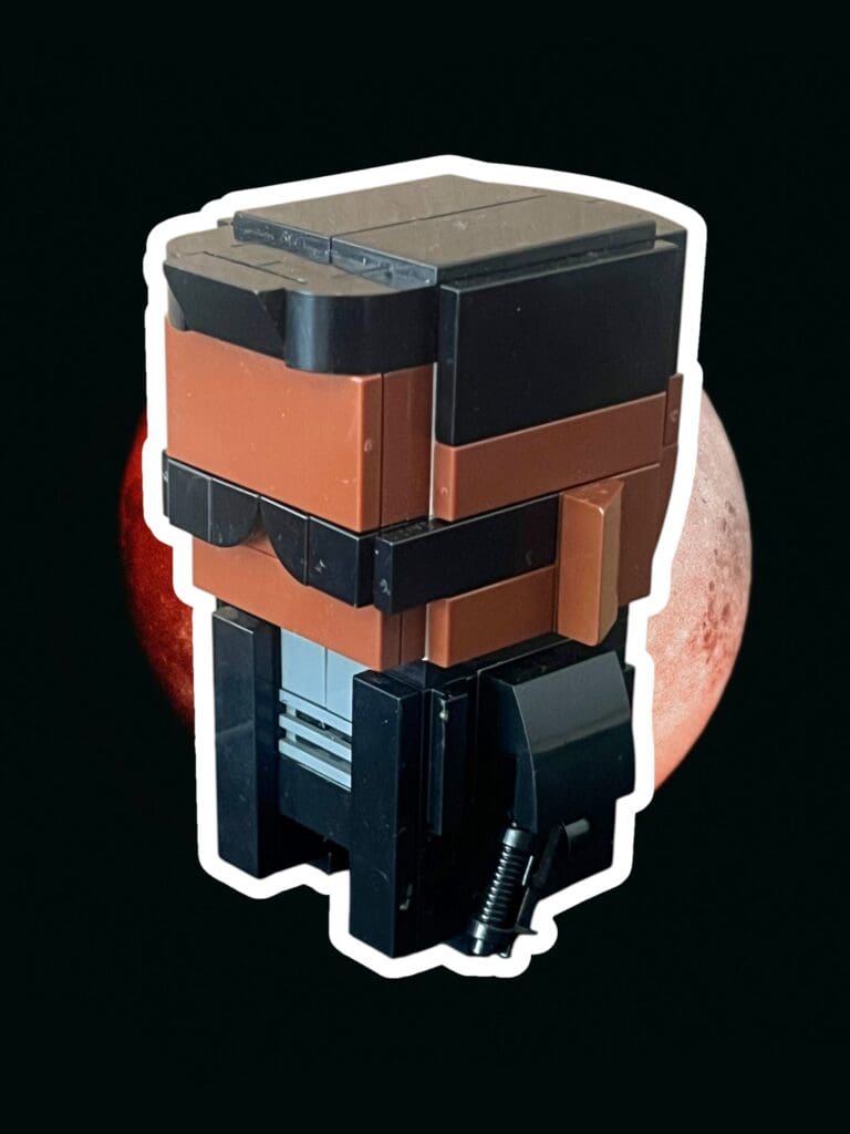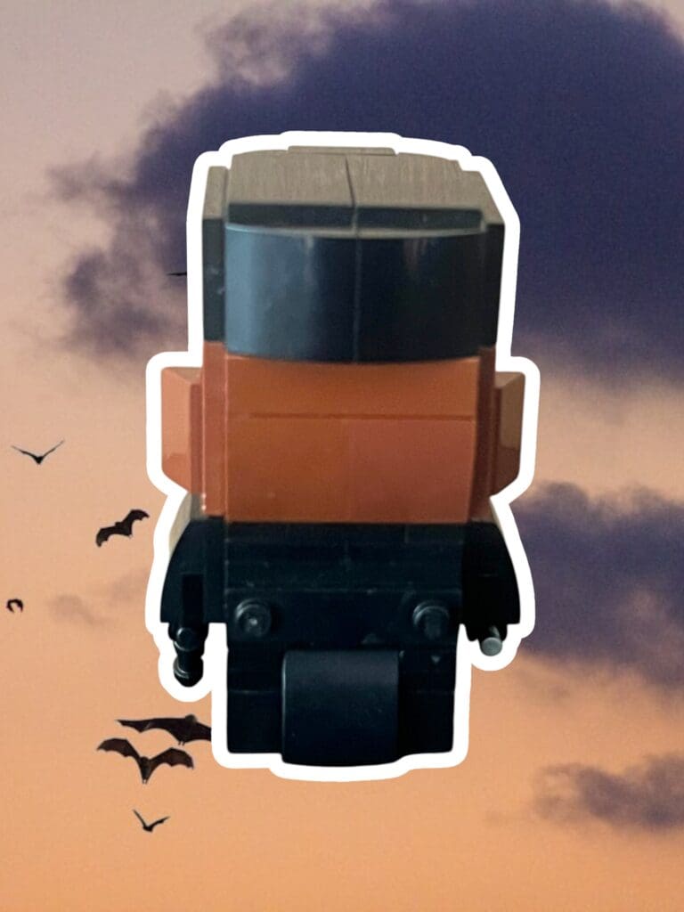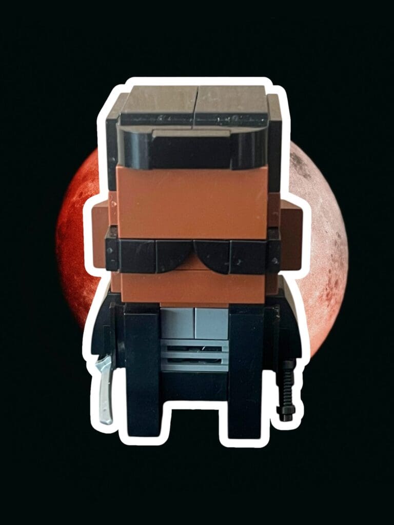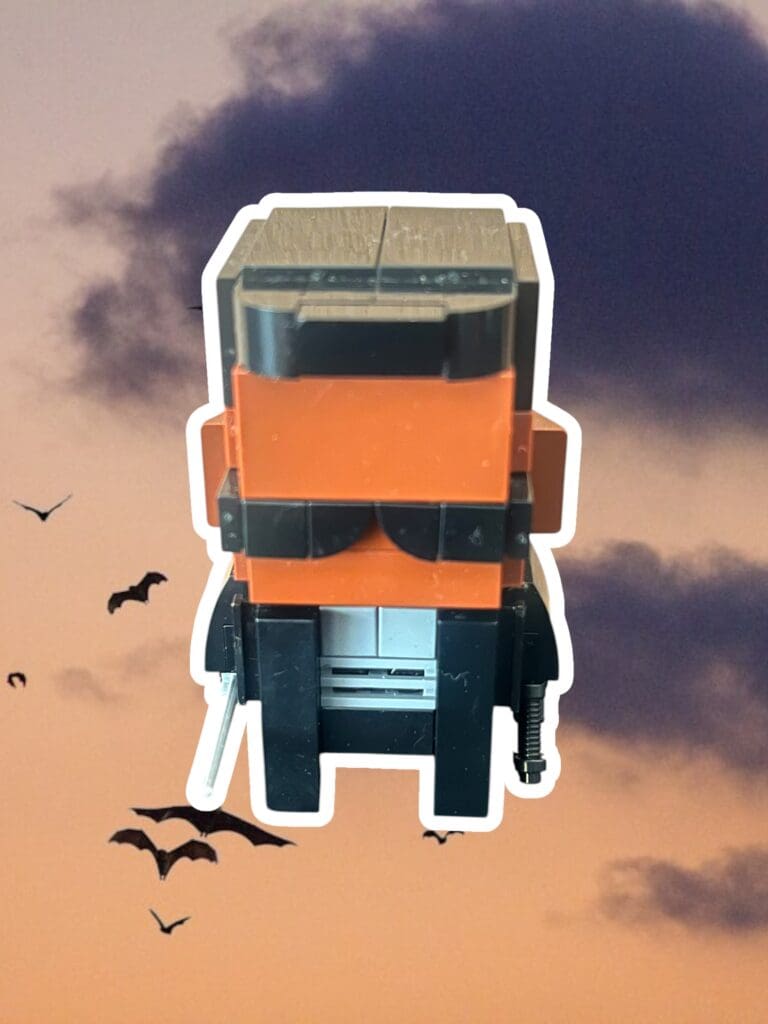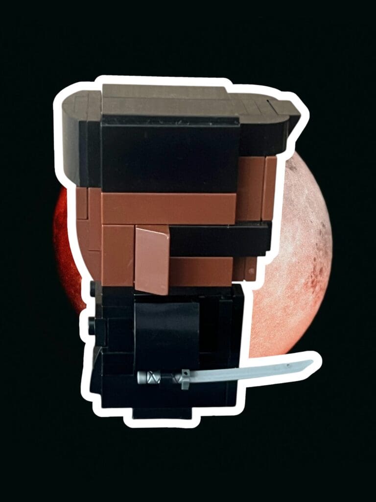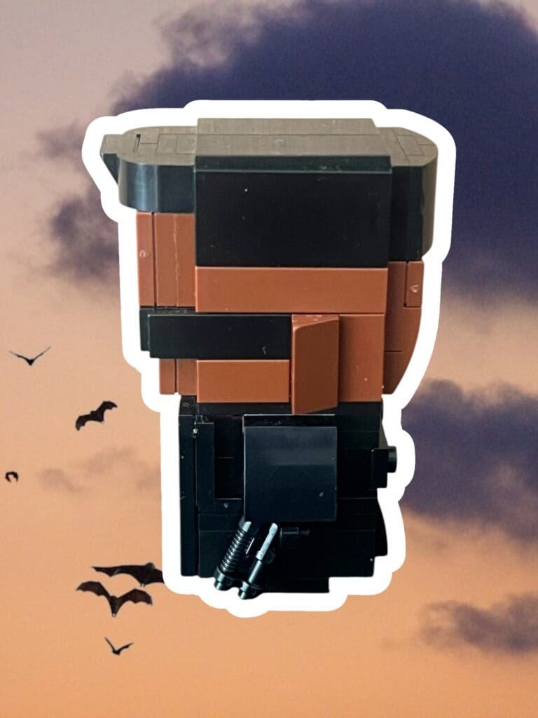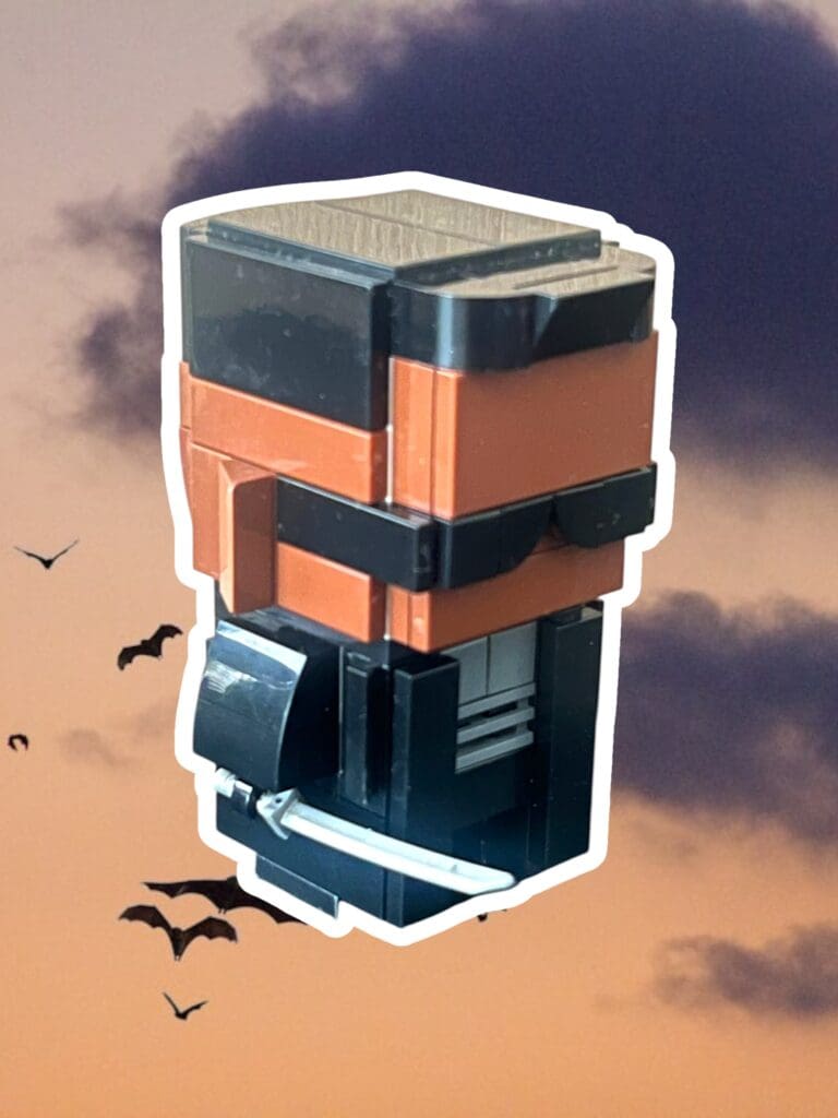 This little BrickHeadz figure? It’s me in miniature—coat, shades, and sword. The essentials. The trench coat’s squared off, sharp edges like steel. Doesn’t flow like leather, but it doesn’t need to. You look at it, you know it’s mine. The red chest piece underneath? That’s blood. Or at least the reminder of it. My reason for hunting.